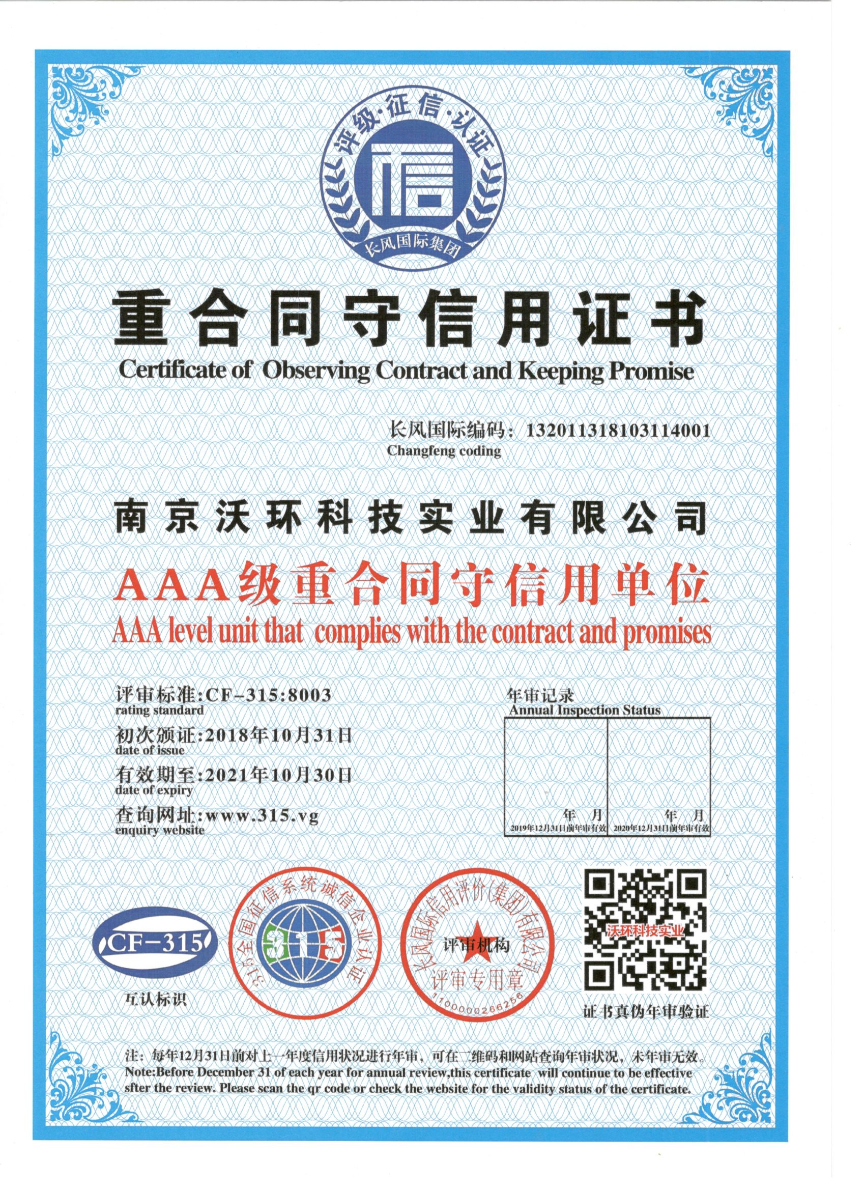 熱烈祝賀南京沃環(huán)公司被專業(yè)評審機(jī)構(gòu)-長風(fēng)國際集團(tuán)評為AAA級重合同守信用單位,特發(fā)此證書